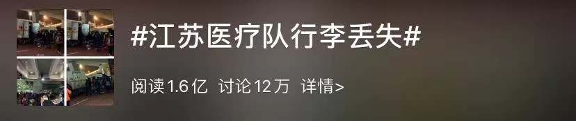仅两日过去,话题#江苏医疗队行李丢失#就引发1.6亿的阅读和12万次热议。有传闻称,江苏支援湖北医疗队在抵达湖北后,出现物资被扣、行李丢失的情况。