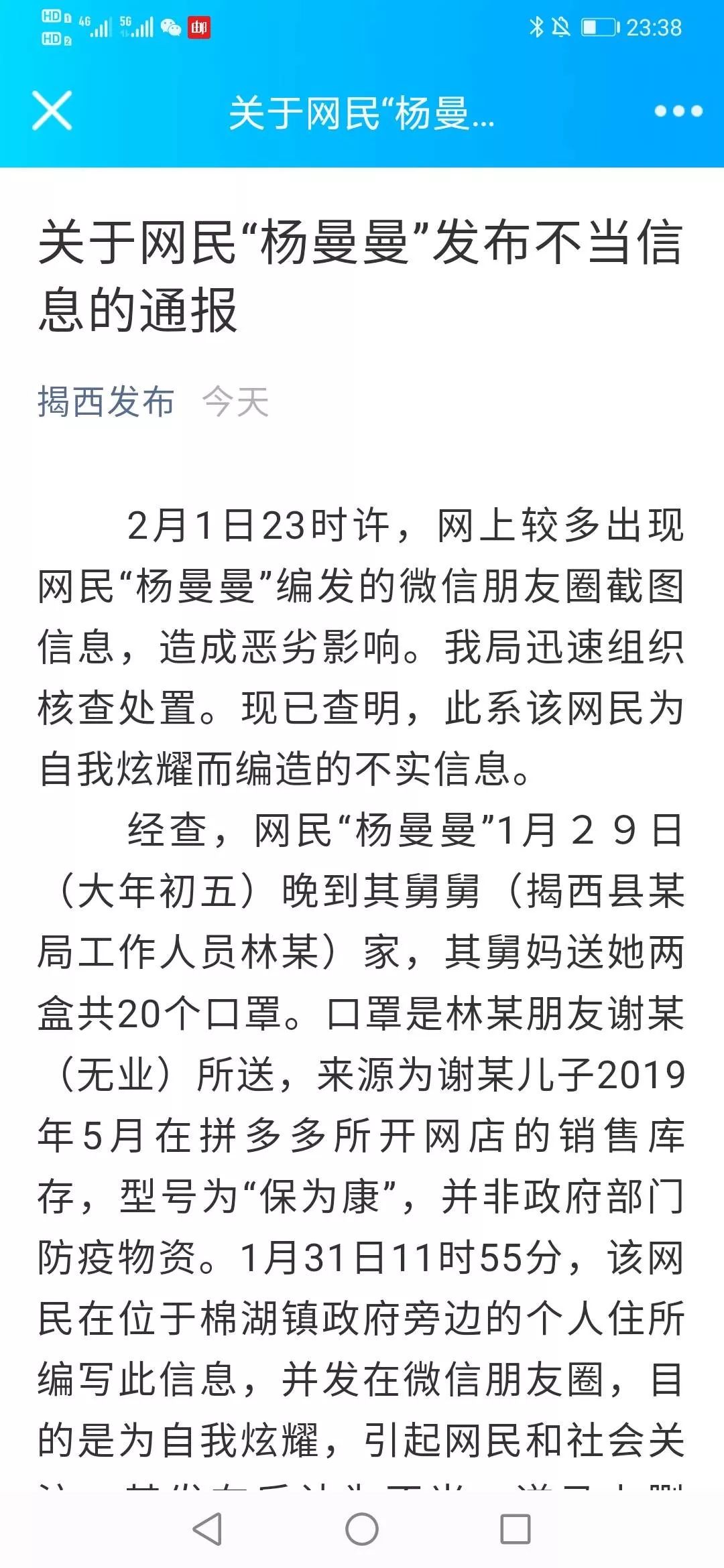 经查,网民“杨曼曼”1月29日(大年初五)晚到其舅舅(揭西县某局工作人员林某)家,其舅妈送她两盒共20个口罩。口罩是林某朋友谢某(无业)所送,来源为谢某儿子2019年5月在拼多多所开网店的销售库存,型号为“保为康”,并非政府部门防疫物资。