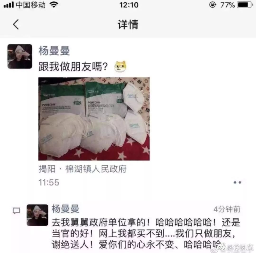 2月1日中午11:55,名为“杨曼曼”的网友晒出了一条标题为“跟我做朋友吗”的朋友圈,并配发疑为一打N95口罩的图片。朋友圈定位地址为“揭阳棉湖镇人民政府”;并评论:“去我舅舅政府单位拿的!哈哈哈哈哈哈!还是当官的好!网上我都买不到……”