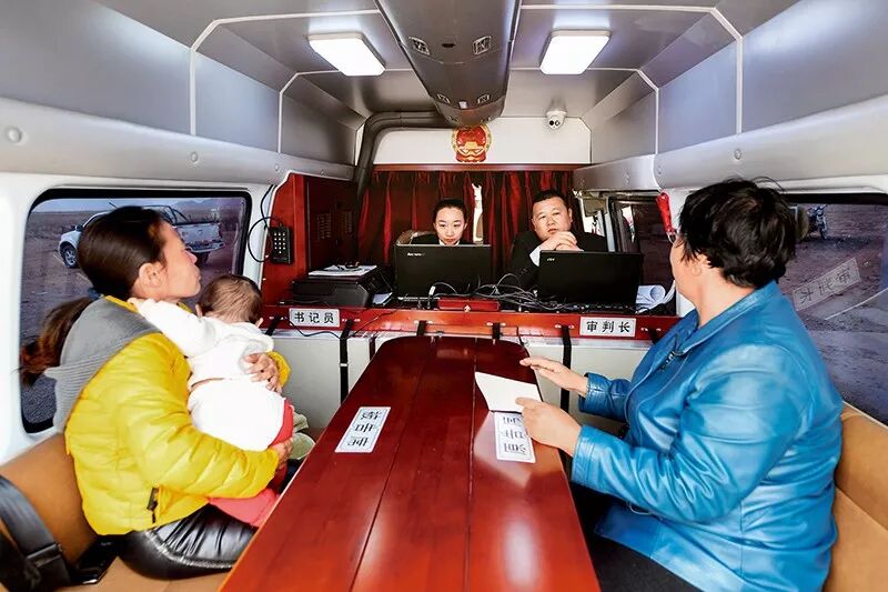 内蒙古自治区乌拉特中旗人民法院的流动法庭深入牧区展开工作,让依法治国的精神不因偏远而丢失,让和谐稳定深入到边境牧民的心中。图为2018年3月27日,乌拉特中旗流动法庭工作人员在流动法庭车上为牧民调解民事纠纷。新华社记者刘磊/摄