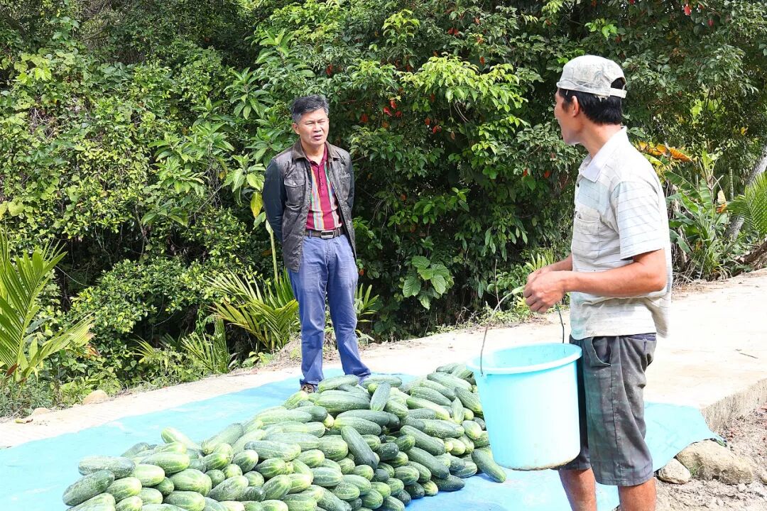 9时许,记者到达村委会后没有见到省检察院派驻保亭县什奋村第一书记兼脱贫攻坚驻村工作队队长邢增进,附近村民们家中开着门,但无人在家。原来,现在正值冬季瓜菜的收获季节,村民们都在田间地头收割瓜菜。果然,在一片豆角田中记者找到了和村民围坐在一起摘豆角的邢增进,他神情专注,不时与村民交谈。