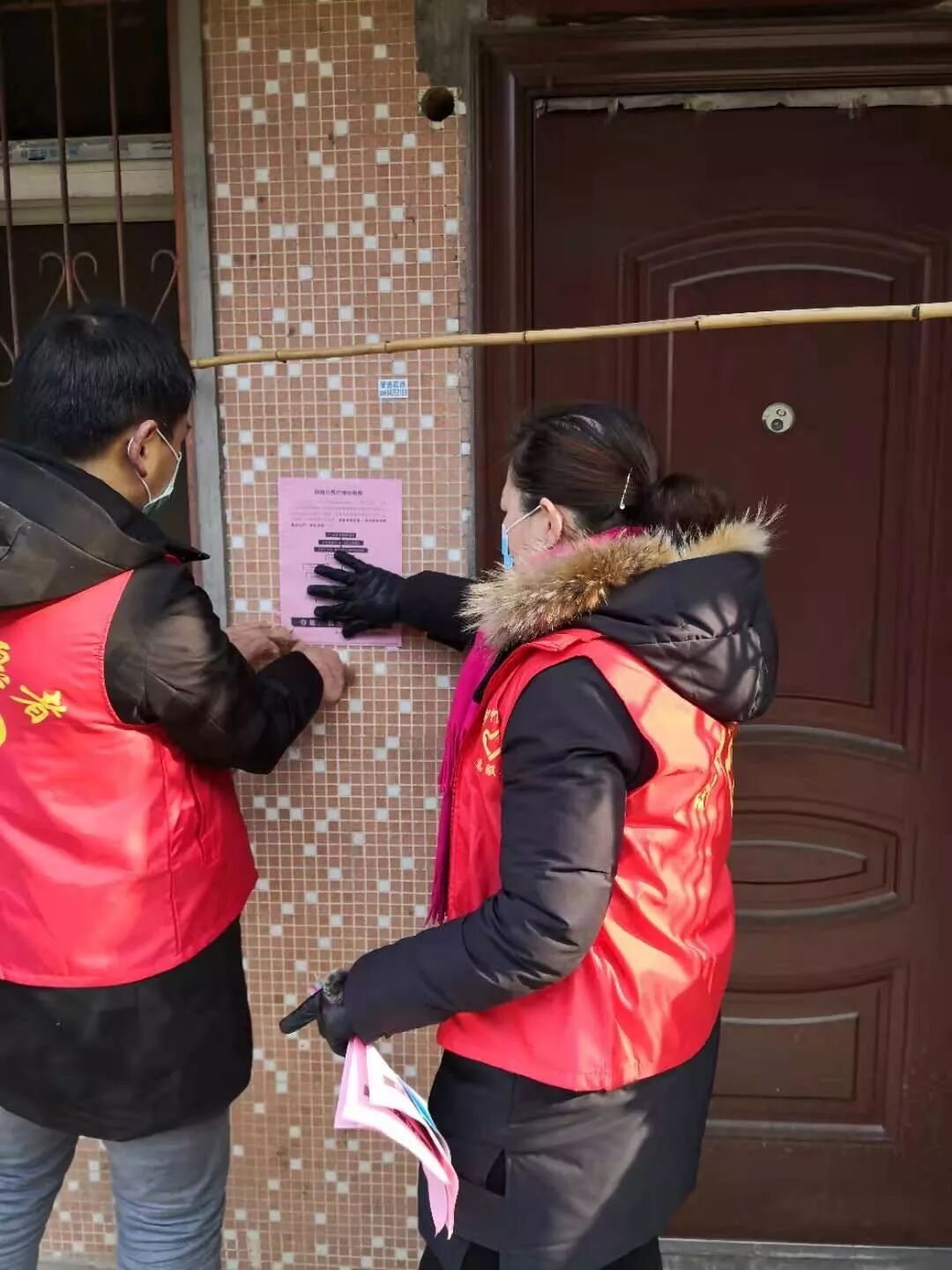 汉南区检察院干警通过电话、微信、上门等方式,帮助社区摸排居民5478户12592人,发现并及时送医有发热症状5人。图为该院干警在街道张贴宣传资料。