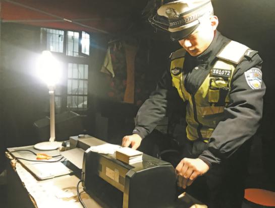 数九寒冬,天黑得更早。1月13日18时许,天已黑透,雨山区西苑社区雨山六村停车棚内,灯火通明,马鞍山交警雨山大队三位民警正在为陆续来停车的居民办理电动自行车上牌业务。一位民警拿着手电筒照亮,一位民警忙着给身份证拍照,另一位民警在上传、打印材料,10分钟不到,雨山三村居民黄春霞的电动车车牌就上好了。