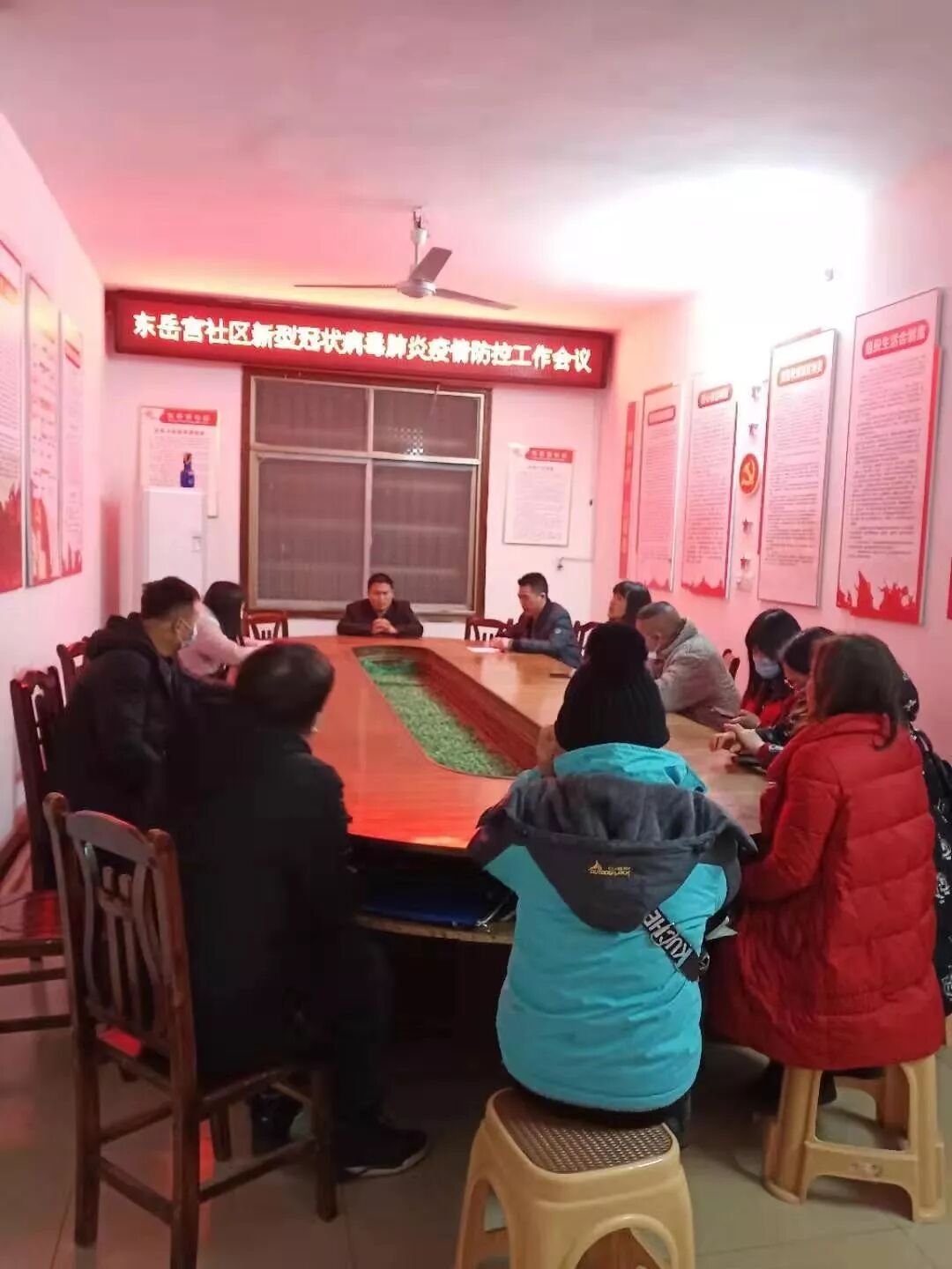 大年三十晚上9时,东岳宫社区召开“新型冠状病毒导致的肺炎”疫情防控部署紧急会议,部署防疫工作,并第一时间通过各类微信群广发《武汉返长人员防病知识宣传单》,做好正面宣传。会上,社区负责人要求网格员和挂点领导分片巡查,对武汉返乡人员指派工作人员跟踪完善信息,要求工作人员注意做好防护措施,并按照要求对社区办公楼每天进行消毒措施。截至1月28日,东岳宫社区对16名从武汉市返回的人员进行了登记,并每天对其实行严格的行程监督,做好疫情监测工作。