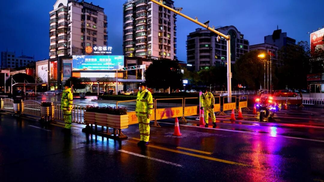 ▲鄂州市公安局民警夜晚在路口封控卡点执勤