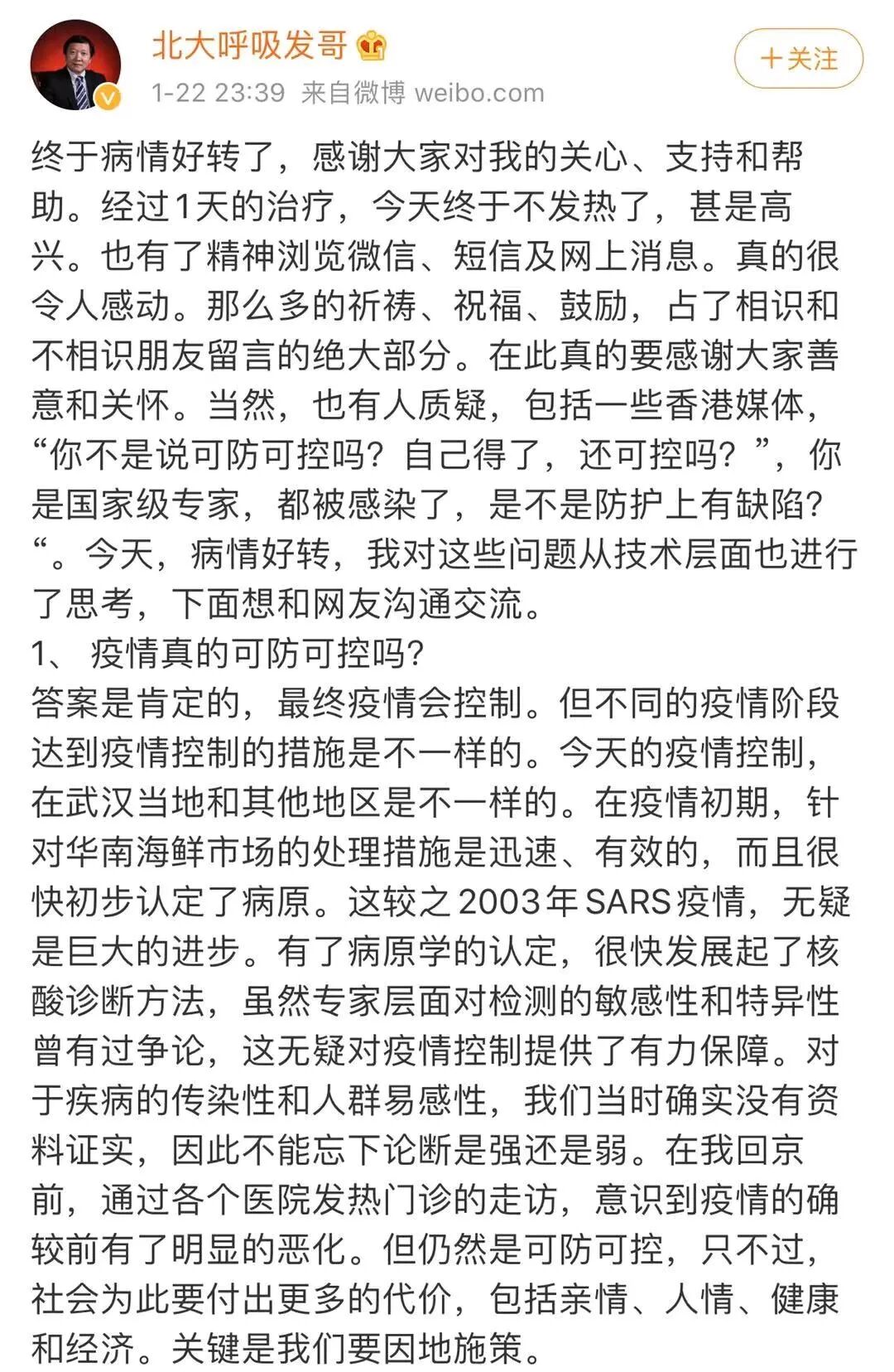 专家的病情牵动无数网友的心。昨天深夜11:39,认证为北京大学第一医院呼吸内科主任王广发的微博用户@北大呼吸发哥发消息报了平安,并对两个焦点问题,做了回应↓