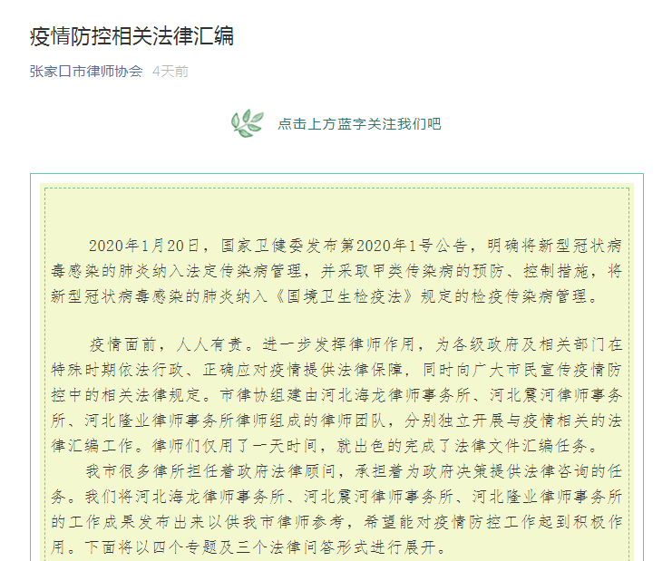 疫情就是命令,防控就是责任。新型冠状病毒感染的肺炎疫情发生以来,张家口市律师协会迅速响应,积极贯彻落实党中央、省、市和市委政法委的各项决策部署,密切关注疫情动态,积极组织律师发挥专业优势,为打赢疫情防控阻击战提供专业法律服务。