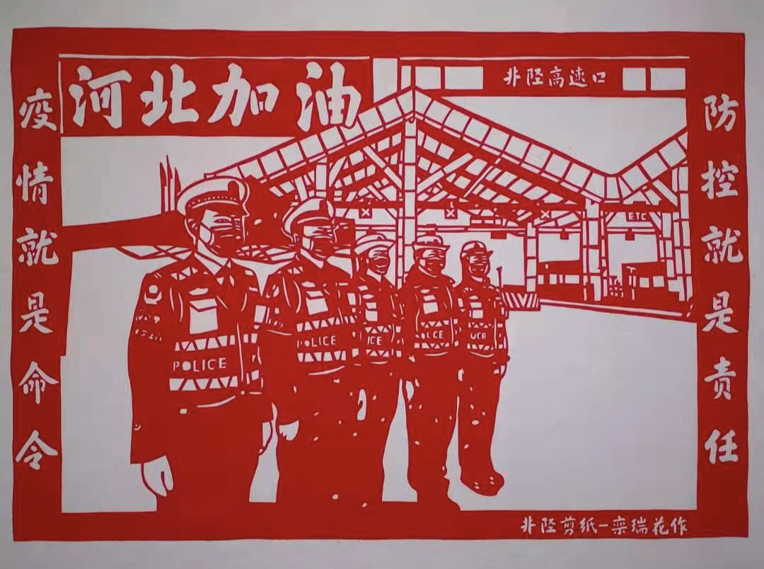 (李忠勇)1月11日,河北省井陉县剪纸传承人栾瑞花女士用剪纸作品为坚守在新冠肺炎疫情防控一线的交警抗“疫”助力。