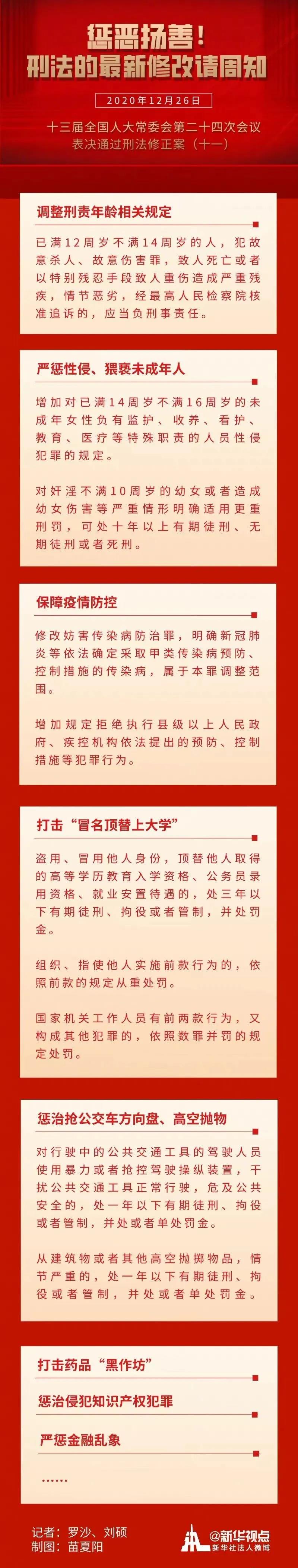 12月26日,十三届全国人大常委会第二十四次会议表决通过刑法修正案(十一) 。本次修正除了对未成年人犯罪的刑责年龄进行调整之外,还包括惩治高空抛物、抢夺公交车方向盘等犯罪行为的条款。至于“冒名顶替”犯罪,比如冒用他人身份上大学,也将追究刑责并处罚金。