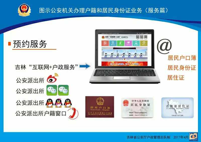公安派出所对办理户籍、居民身份证和居住证的业务提供了预约服务。通过吉林“互联网+户政服务”群众可以预约办理时间、预约办事地点和提前提交电子版的相关证明材料进行核对,全省各地公安派出所还建立了微博、微信和QQ群,公布了公安派出所和户籍窗口服务电话,据统计,2016年4月6日以来已为110万名群众办理户籍、居民身份证、居住证、出具证明提供了预约服务,各地公安机关户政支队(大队)采用多种途径为群众提供服务,实现了让信息多跑路,让群众少跑腿,不让群众跑第二趟的目的。