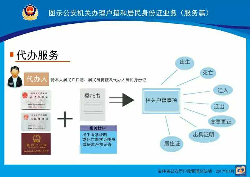 针对外出务工人员办事不便,全省公安派出所户籍窗口一直以来就提供户籍业务代办服务,代办人提供当事人的居民户口簿和居民身份证,委托书面证明和代办人的居民身份证,及相关证明,就可以代为办理户籍业务。如父母在同一居民户口簿,提供新生儿《出生医学证明》即可代办落户。死亡、迁入、迁出、变更更正、出具证明均可代办。