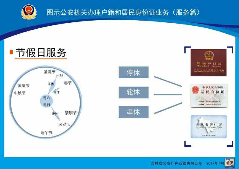 全省公安机关户政大厅采取民警倒班、串休方式,保证节假日、休息日能够正常办理户籍业务;派出所户籍窗口保证节假日、休息日至少有一天接待群众,其他时间提供预约服务。
