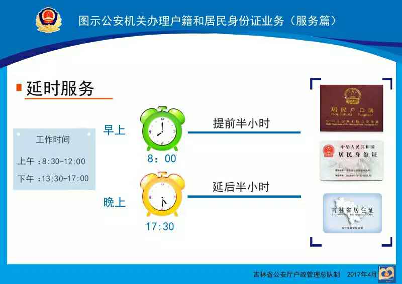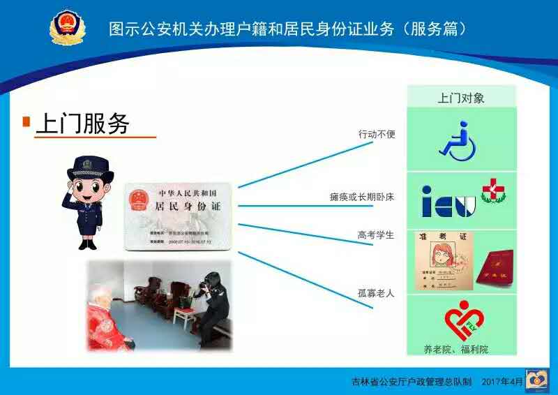 为有效解决群众反映强烈的办户口难、办居民身份证难的突出问题,切实改进公安机关户政窗口工作作风,提高服务质量,吉林省公安厅有针对性的不断推出预约服务、代办服务、上门服务、延时服务、节假日服务。