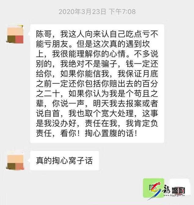 王某说的话如果用几个成语形容,那肯定是“推心置腹”“高情厚谊”“掏心掏肺”“情真意切”……然而2个多月过去了,陈先生迟迟未收到货,在陈先生催货时,王某开始还敷衍几句,后来干脆联系不上了。陈先生意识到自己被骗,于是到东宁市公安局报了案。