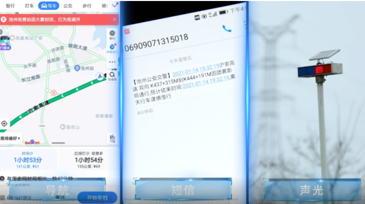 “早一分钟发布大雾预警信息,采取有效的管控措施,就可能减少一起事故的发生。”池州市公安局交警支队道路交通指挥中心副主任陈广柱介绍,团雾感知预警系统发出预警信息,经确认后,会第一时间同步在多个渠道发布,对应路段上的诱导屏、高音喇叭、爆闪警示灯会进行对应的联动响应,还会发布到互联网地图、通信运营商。