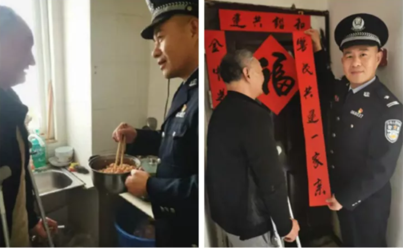 韩某华老人,是亳州民警贾良臣的脱贫帮扶对象。老人如今已经脱贫,但因为他腰部残疾,又一人独居,贾良臣始终对他放心不下,经常来为他打扫卫生、整理被褥。大年三十这一天,贾良臣特意赶来老人家里,不仅带着春联、大米、食用油送来祝福,还帮助老人贴上了春联!
