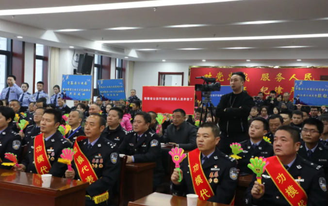 现场气氛热烈隆重,“感谢省厅关怀 不负人民重托”一条条横幅被高高举起,观看演出的金寨县基层民警、功模代表、警察家属以及社会各界群众把派出所内外围的满满当当,一些闻讯而来的当地群众更是踮着脚尖、拍着巴掌看完了全程宣讲演出。