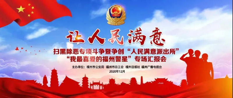 12月11日晚,由福州市公安局、福州市总工会、福州日报社和福州广播电视台联合举办的“让人民满意——扫黑除恶专项斗争暨争创‘人民满意派出所’‘我最喜爱的福州警星’专场汇报会”在福州市工人文化宫隆重举行。