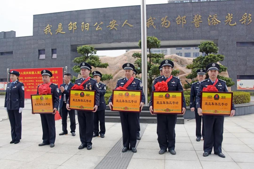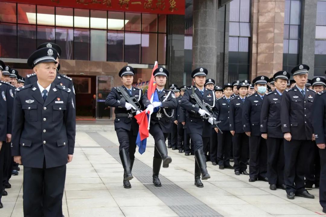 早上8时,精神抖擞的警旗护卫队迈着铿锵的步伐将警旗护送至升旗台,在慷慨激昂的《中国人民警察警歌》中,红蓝相间的警旗缓缓升起,在蓝天下迎风招展,猎猎飘扬。全体民警向警旗庄重敬礼,重温入警誓词,“对党忠诚、服务人民、执法公正、纪律严明”,坚定的誓言响彻升旗广场。随后,市局举行“从警30年荣誉勋章”授勋仪式,尹华安、李盛等15名民警和老同志代表领取了纪念章;大祥公安分局刑侦大队等10个荣立“集体三等功”的单位领取了奖状,肖祎晨等30名荣立“个人三等功”的民警同时受到表彰。
