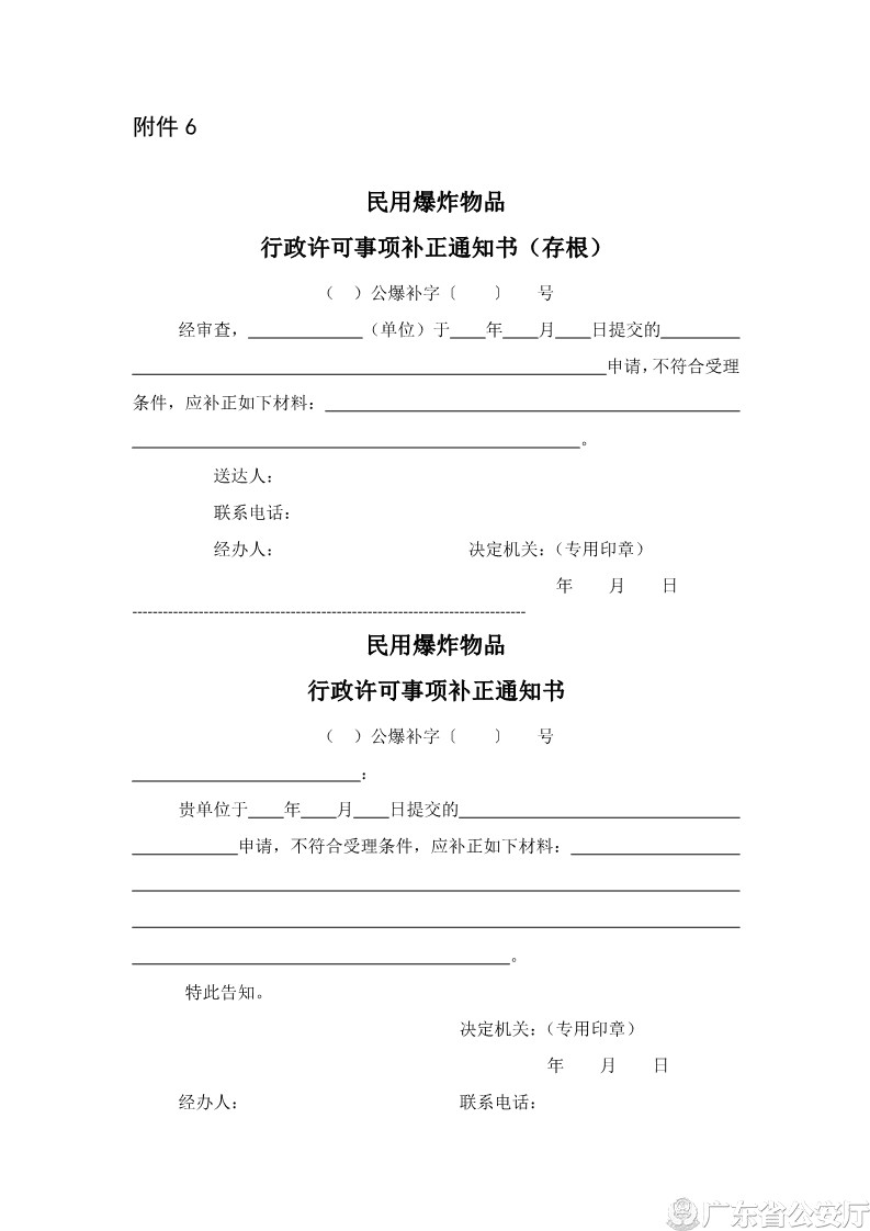 (二)申请材料不齐全或不符合法定形式的,应及时发出《民用爆炸物品行政许可事项补正通知书》(附件6),一次性告知申请单位需要补正材料的全部内容;