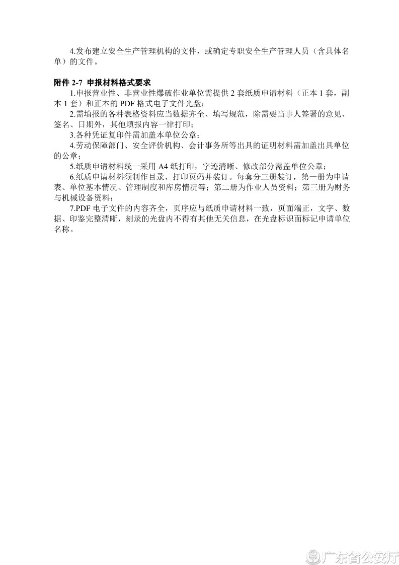 一、深化“放管服”改革,进一步精简申办材料。按照公安部《关于不再要求提供有关规章设定证明事项和取消有关规范性文件设定证明事项的通知》(公法〔2018〕1248号)要求,相关企业在申办爆破作业单位资质时,不再要求提供“爆破作业业绩证明”“技术负责人从业经历证明”“从业人员资格证明”。按上述要求,省公安厅已在《广东省公安厅爆破作业单位行政许可和管理工作实施细则(2020年修订)》中进行了相应修订。各地要及时调整本地之前制定、公布的相关文件及办事指南,不再要求申办企业继续提供上述证明材料。