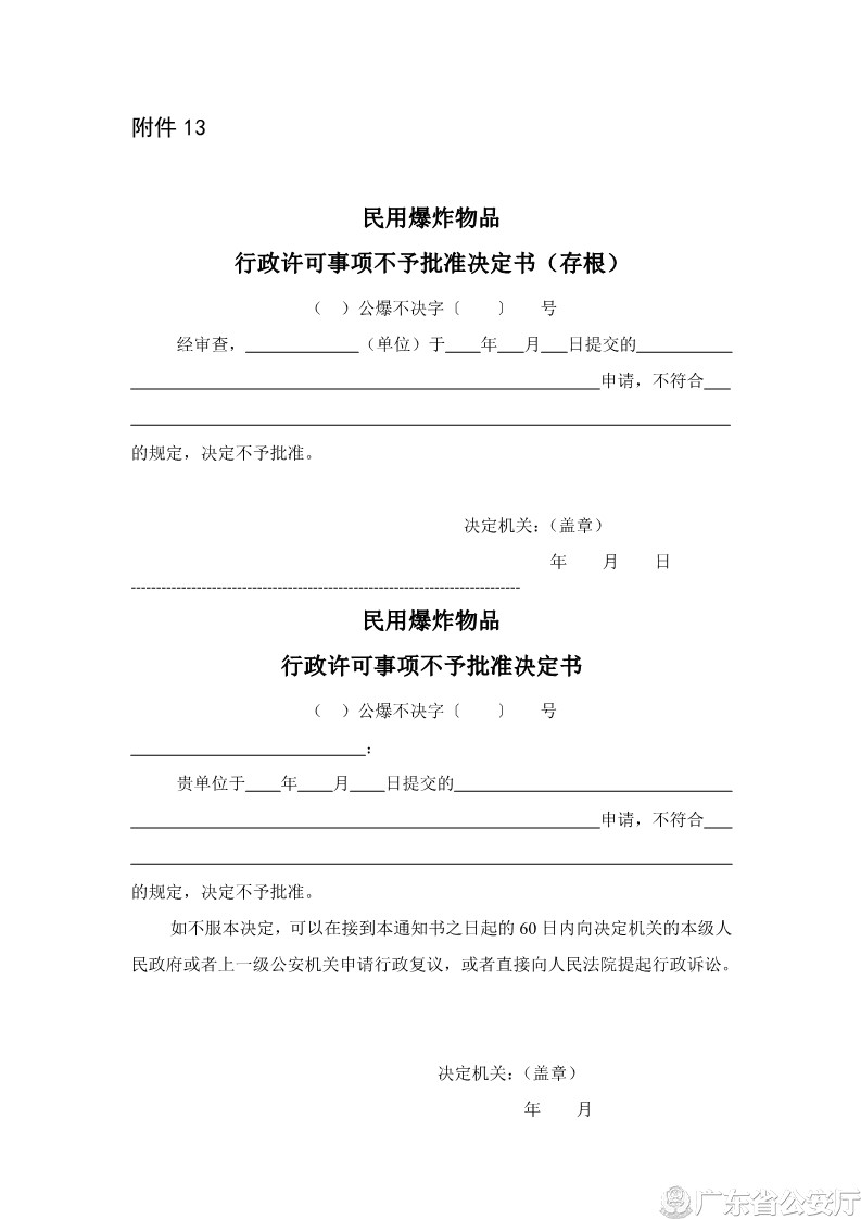 第十九条 准予爆破作业单位行政许可的,在互联网上公示相关内容信息(附件13-1),公示期5日;不予行政许可的,发出《民用爆炸物品行政许可事项不予批准决定书》(附件13),并告知申请单位享有依法申请行政复议或者提起行政诉讼的权利。