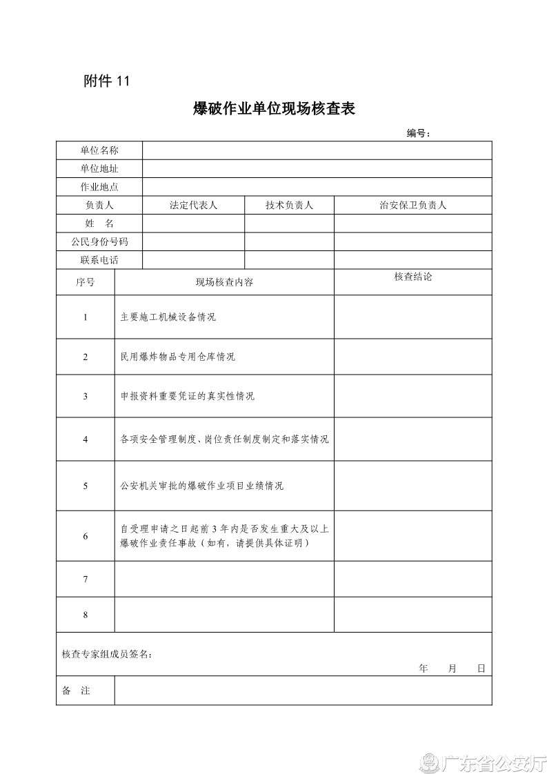 第十五条 现场核查结束后由专家组填写《爆破作业单位现场核查表》(附件11)并制作成电子文件。核查表一式4份,申请单位、参与现场核查的公安机关、专家组和受理申请公安机关各1份。