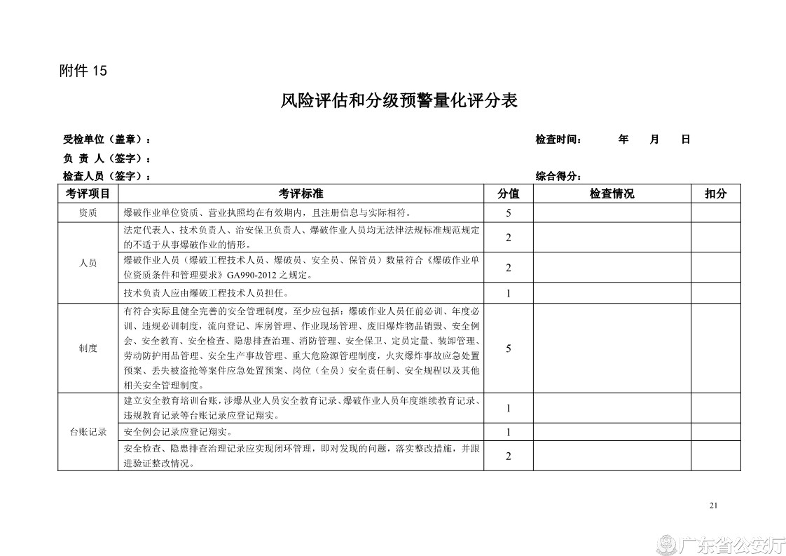 第三十九条 各地级以上市公安机关应对照《风险评估及分级预警量化评分表》(附件15),对在辖区内实施爆破作业的单位以半年为一考核周期组织进行量化评分,并按评分情况进行安全预警等级评定。