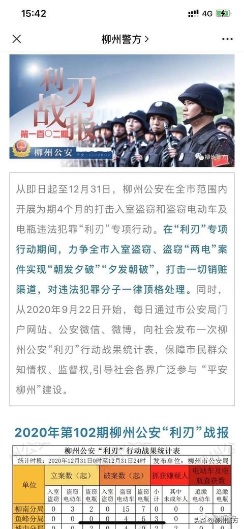 什么犯罪突出就重点打击什么犯罪,这是柳州市公安局对全市人民最庄严的承诺。针对盗窃电动车及电瓶违法犯罪高发态势。从2020年9月至12月,市公安局在全市部署开展为期4个月的打击入室盗窃和盗窃电动车及电瓶(以下简称“一盗两电”)违法犯罪“利刃”专项行动。“利刃”出鞘显锋芒,经过4个月的重拳打击,“利刃”专项行动成效显著,社会治安明显好转,平安柳州建设又往前迈进一步。