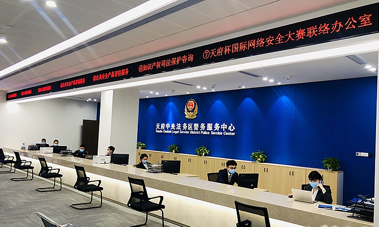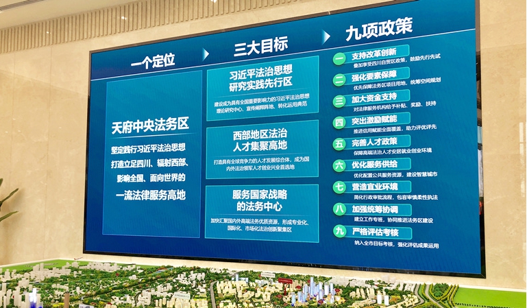 “法治是最好的营商环境”,这句话标识在天府中央法务区综合服务中心一楼大厅显眼处墙面。迈步新时代新征程,随着“一带一路”、成渝地区双城经济圈建设等重大战略的推进,各种“高精尖”产业在四川聚集,与此相配套适应的法律服务也须跟进。天府中央法务区融入天府中央商务区总体规划,围绕实现“政商学研企”融合发展和法务业态全链条发展,形成了公共法律服务中心、高端法律服务产业发展带、法治文化交往节点“一心一带多点”功能布局。除了警务服务中心外,天府中央法务区同时入驻了一批政法服务窗口单位,有较大影响的律师、公证、仲裁、司法鉴定等法务机构,市场监管、知识产权、会计等涉法务机构,下一步还将不断加大高能级机构招引、高端法治人才引进、重大项目建设推进力度。