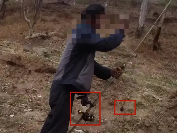 民警上前查看,发现两名男子使用可视锚鱼竿进行非法捕捞。可视锚鱼竿上含有摄像头,将有摄像头一头的鱼竿放入水中,摄像头在水中捕捉影像,传输至鱼竿上的可视视频,然后犯罪嫌疑人通过可视视频看见鱼在周围游动,便提起鱼竿,直接将鱼身刺穿,鱼当即死亡。