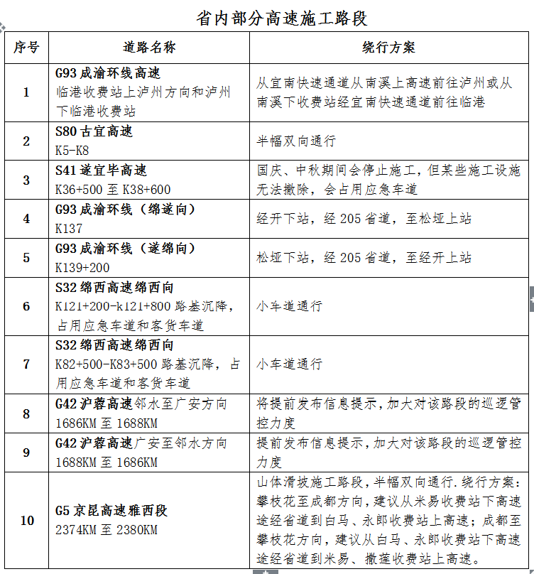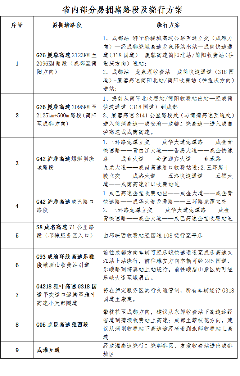 “国庆、中秋”假期,成都绕城、成南、成温邛、成巴、成雅、成渝、渝蓉、成自泸、雅康、雅西、内宜等主干高速公路通行压力较大;进出城高速公路和通往景区路线上的隧道、互通立交、收费站、服务区是易拥堵段点。