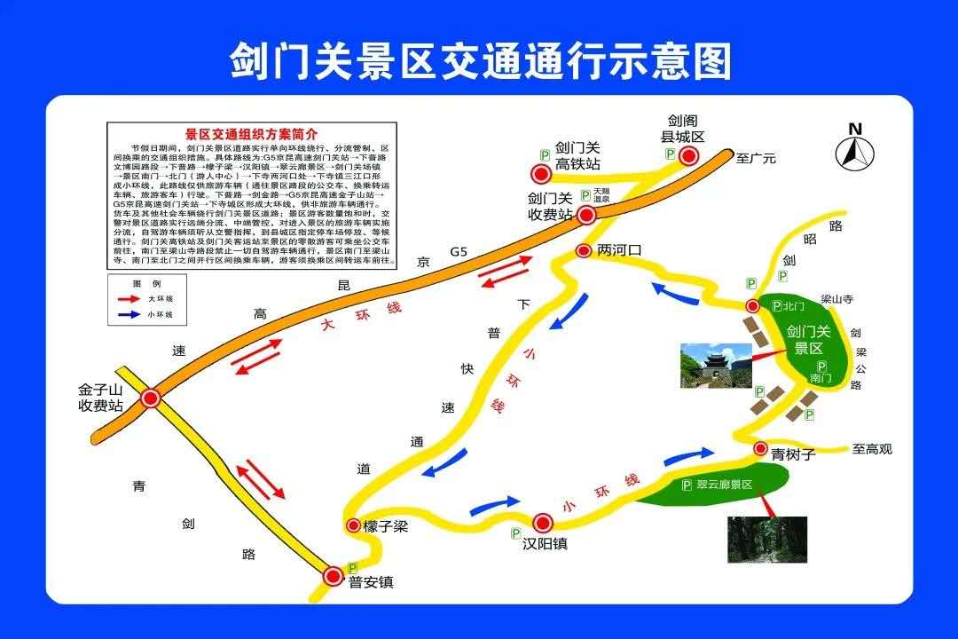 单向环线通行。国庆期间,剑门关景区道路实行单向通行、环线绕行,具体路线为:(1)G5京昆高速剑门关站-下普路文博园路段-下普路-汉阳镇-翠云廊景区-剑门关场镇-景区南大门-景区北大门(游人中心)-下寺两河口处(下普路与国道108线交汇处)-下寺镇三江口形成环线。7:00—22:00,此路线只允许旅游车辆(通往景区路段的公交车、旅游客车、自驾车)行驶。(2)下普路-剑金路-G5京昆高速金子山站-G5京昆高速剑门关站-下寺城区形成大环线,供非旅游车辆通行,绕行剑门关景区道路。