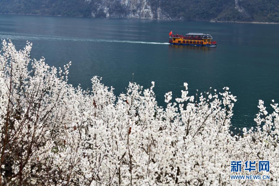 2月19日,游船行驶在贵州省黔西县新仁苗族乡化屋村旁的乌江源百里画廊景区。新华社记者 杨文斌 摄