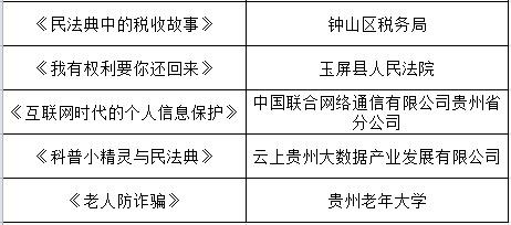 据悉,今年8月,省司法厅、省委网信办、省法宣办联合举办的贵州省“美好生活 民法典相伴”主题公益广告微视频征集展播活动开展以来,得到全社会公众的积极响应和参与,共收到197部作品,不少作品主题鲜明、内容丰富,创意独特,表达了民法典作为公民的百科全书,守护人民美好生活的深刻内涵。经过初评、专家评审和评审组定评等阶段,最终评选出一等奖2部,二等奖4部,三等奖6部,优秀奖23部。