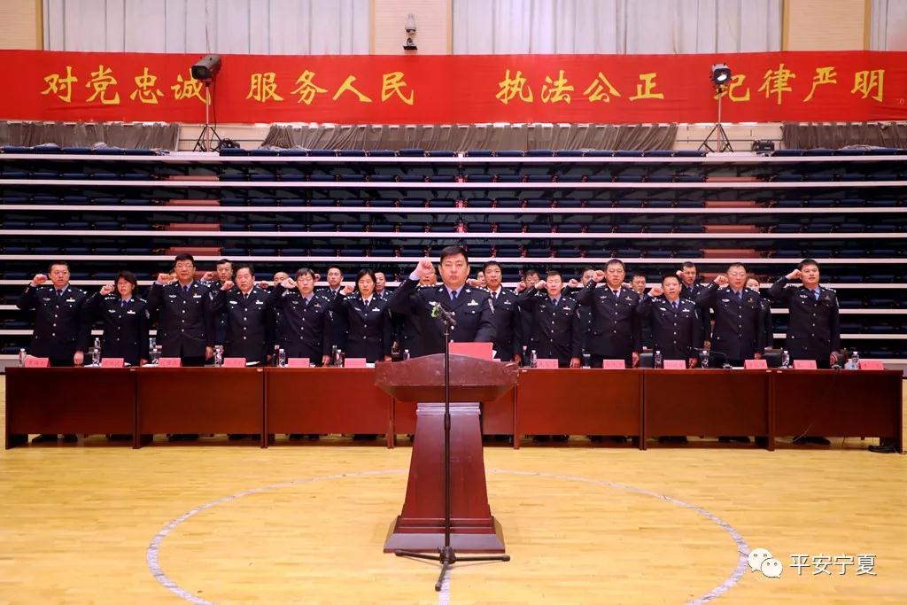 宪法宣誓仪式上,全体参会人员齐唱中华人民共和国国歌。领誓人左手抚按《中华人民共和国宪法》、右手举拳,与新任职处级干部面向国旗庄严宣誓,自治区副主席、公安厅党委书记、厅长兼督察长杨东监誓。