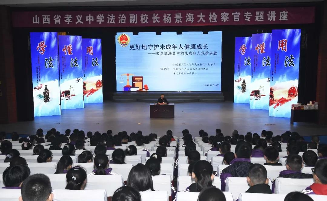 11月16日,省检察院党组书记、检察长、二级大检察官杨景海来到孝义中学,以“更好地守护未成年人健康成长——聚焦《民法典》中的未成年人保护条款”为题,为600余名高一学生和全市80余名德育副校长带来一堂法治教育课。这是他2018年12月受聘担任孝义中学法治副校长以来,第五次来校履职。