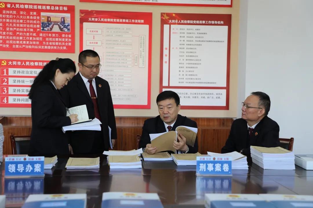 在大同市检察院,杨景海查看了相关重点工作资料,对检察文书进行了阅卷调研。