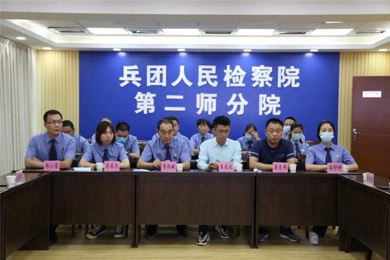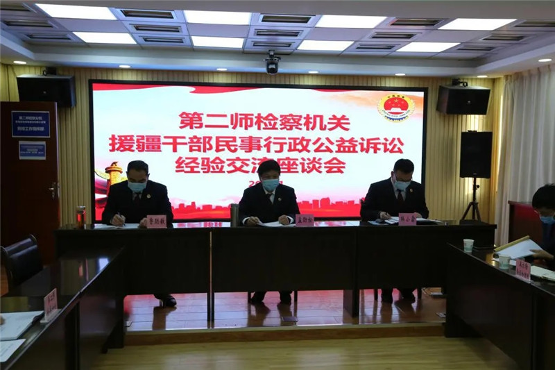 图为行政二师分院援疆干警鲁聪敏、韩小雷参加兵团二师援疆干警民事行政公益诉讼经验交流座谈会,介绍工作经验。