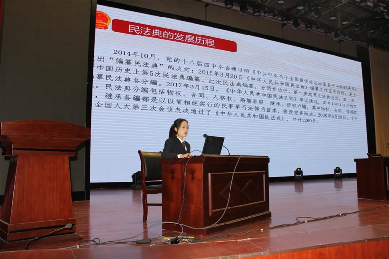 图为乌鲁克垦区检察院援疆干警苗舒舒在33团文体活动中心报告厅为100余名民兵讲授民法典。