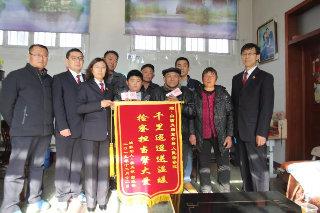 日前,左云县人民检察院3名检察官千里迢迢来到山东省邹城市北宿镇兴隆村,将饱含深情厚谊的20000元司法救助款送到一起交通肇事案被害人儿子和其父母手中。涉嫌交通肇事的谢某某在检察机关对其作出相对不诉的决定后,面对不辞劳苦来到他家乡的检察官,激动地拿出事先做好的一面书写着“千里迢迢送温暖,检察担当擎大爱”的锦旗赠送给远道而来的晋北检察官,感激之情无以言表。
