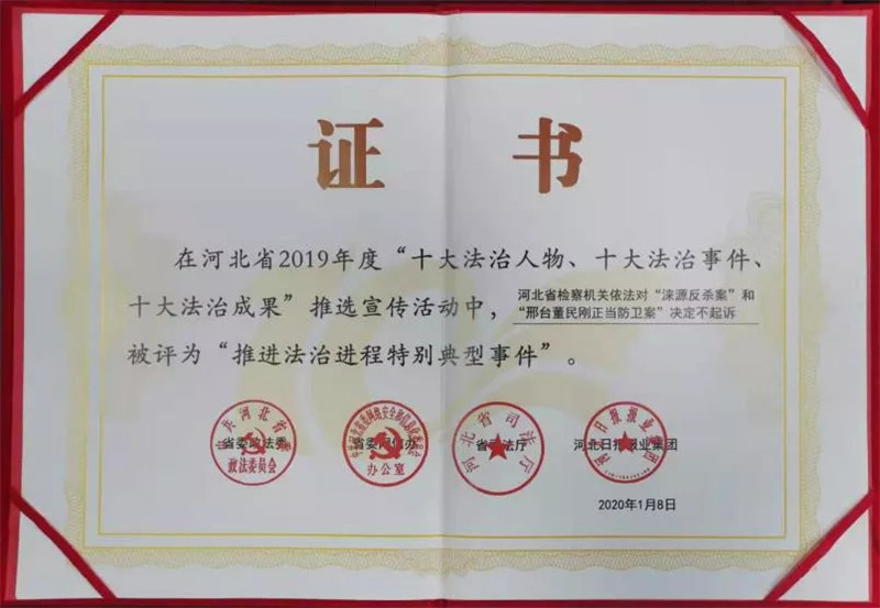 “涞源反杀案”“邢台董民刚正当防卫案”被评为“推进法治进程特别典型事件”。