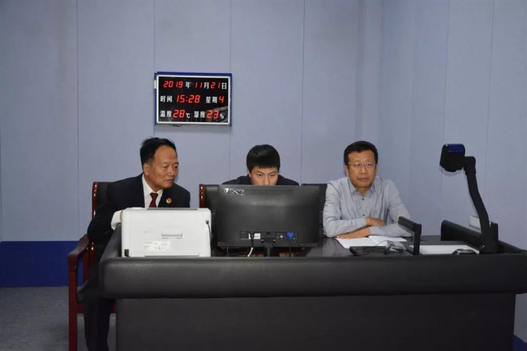 党组书记、检察长魏元桂,党组成员、检委会专职委员王文业,员额检察官朱德对“杜某骗取贷款案”的犯罪嫌疑人进行了远程提讯。