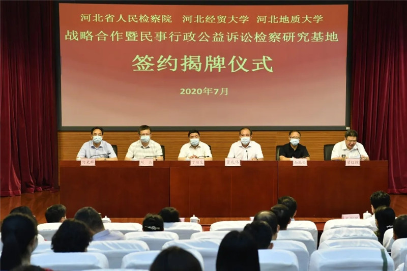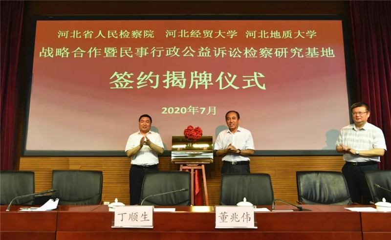 7月16日上午,河北省检察院与河北经贸大学、河北地质大学在河北经贸大学举行检校战略合作暨民事行政公益诉讼检察研究基地签约揭牌仪式。