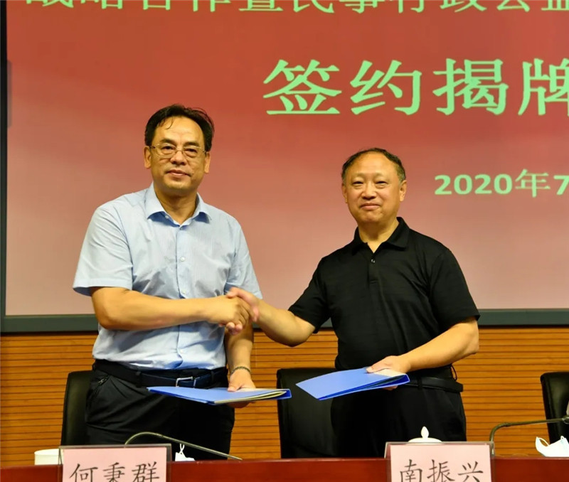 省检察院副检察长何秉群与河北地质大学党委副书记南振兴共同签署《战略合作协议》《共建公益诉讼检察研究基地合作协议书》。