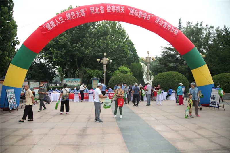 在第33个“国际禁毒日”到来之际,河北省检察院、石家庄市检察院、石家庄市桥西区检察院联合在石家庄市西清公园开展“国际禁毒日”法治宣传活动,其他市、县(区)院同步开展法治宣传活动。宣传活动以“健康人生,绿色无毒”为主题。检察人员现场介绍了毒品种类,常见的毒品犯罪类型,如走私、贩卖、运输、制造毒品罪,非法持有毒品罪,非法种植毒品原植物罪等,通过禁毒展板、发放宣传资料等方式,宣传法律知识,鼓励群众发现涉毒违法犯罪活动,及时向司法机关举报,让毒品犯罪无处可藏,让更多的人远离毒品。结合全省检察机关办理的涉毒案件,讲解毒品对个人、家庭、社会的危害,进一步加深群众对毒品犯罪的认识。