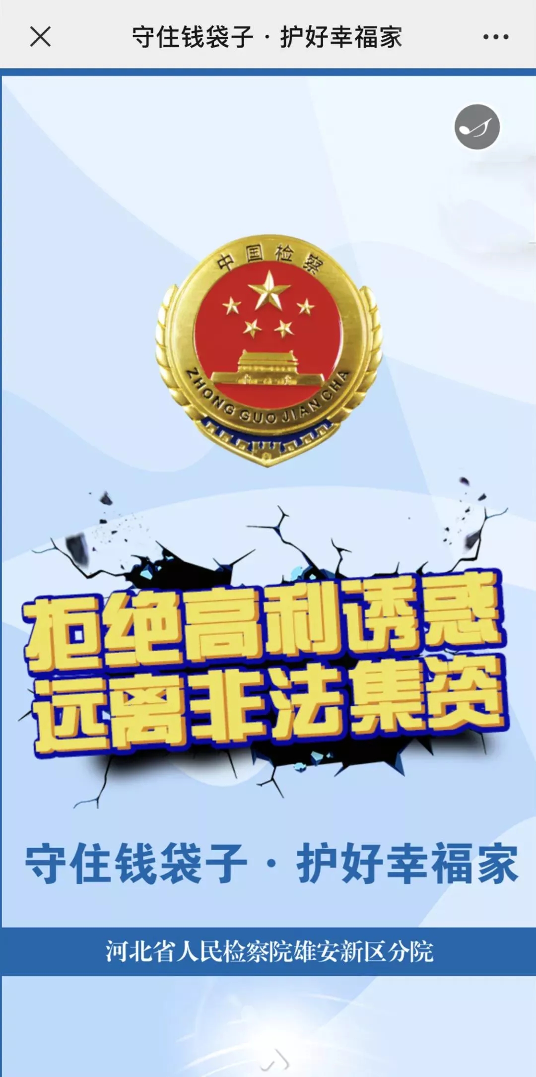 雄安新区分院制作“拒绝高利诱惑 远离非法集资”H5,检察官提醒群众提高风险意识,谨记“天上不会掉馅饼”,对“高收益、无风险”等所谓的投资项目要擦亮眼睛,提高警惕,谨防受骗。