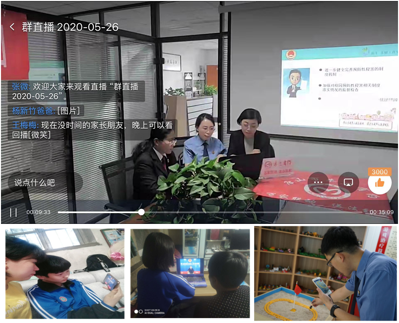 开放日活动期间,唐山市检察院及十二个县区院同时通过微博直播、钉钉直播、视频连线、微信公众号等平台全程直播检察开放日活动。秦皇岛市检察机关采用“空中云课堂”、抖音等形式由未检检察官、心理咨询师等以案释法11场次,制作“知心姐在行动,抗击疫情平安建家”系列微课课程共38节。保定市检察机关在“保定检察”微信公众号开设了为期17天《护蕾法治小课堂》栏目,围绕未成年人自我防护等热点问题进行专题授课。石家庄市检察院精心制作了《〈三国演义〉中的防疫智慧》课件,提供给市教委,由市教委组织学生线上观看、学习。邯郸市检察院特别邀请邯郸市心理咨询师协会秘书长、国家二级心理咨询师马晓荣为与会代表作了主题为“高效沟通,助力孩子顺利回归课堂”心理健康讲座,并将课程录制后通过“钉钉”APP向邯郸相关学校师生进行推送。承德市双桥区检察院组建团委、妇联、人民监督员和学生家长等相关人员参与的检察开放日活动微信群,通过群视频会议、群内留言等形式,畅谈未成年司法保护救助工作,制作电子宣传册、抖音视频,让检察官走进网络课堂,宣讲法律和防疫知识。定州市检察院未成人年检察干警携手定州市实验小学教师,通过小学的教学软件,为学生上法治课,教学生如何远离危险自我救助、如何在疫情期间排解自己的不良情绪。辛集市检察院联系辛集市和睦井中学,采用钉钉直播的形式,为该校初一学生进行主题网课直播,围绕检察机关的职能以及常见的发生危害未成年人安全的隐患进行讲解。
