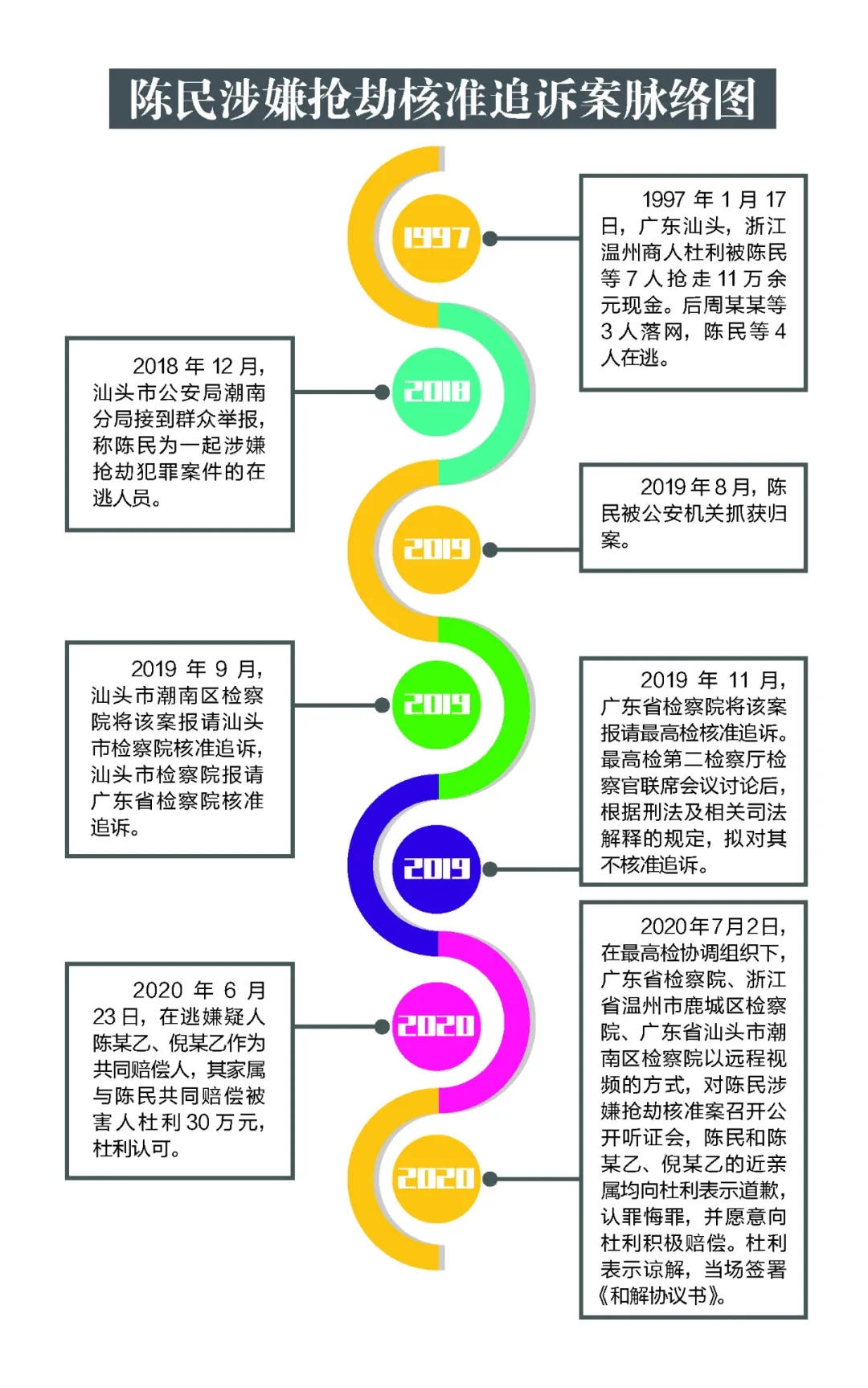 在双方达成和解赔偿意向后,7月2日上午10点,在最高检的协调组织下,广东省检察院、温州市鹿城区检察院、汕头市潮南区检察院再次以远程视频的方式,对陈民涉嫌抢劫核准案召开了一场公开听证会。汕头市潮南区人大代表、政协委员在潮南区检察院分会场旁听。