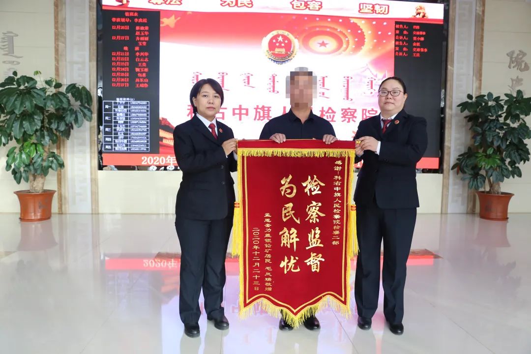 办案人员在会后积极联络、多方沟通,通过科尔沁右翼中旗医保局、社保局工伤保险股协调上级机关,最终认定老毛的手术费可以在工伤保险中予以报销。收到医保部门肯定的报销答复,老毛手捧“检察监督为民解忧”的锦旗,来到科尔沁右翼中旗检察院。